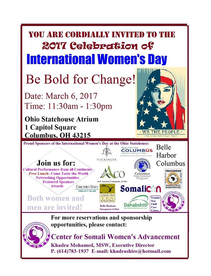 The 2017 International Women’s Day, with the theme, “Be Bold for Change” will hold Monday, March 6, 2017 at the Ohio Statehouse Atrium, 1 Capitol Square, Columbus, Ohio beginning 11.30am and ending 1.30pm. Coordinator and Executive Director of Center for Somali Women’s Advancement, Khadra Mohamed said, “the event is a solid platform of networking with high profile speakers expected in attendance,” adding that “it is opened to both men and women.”